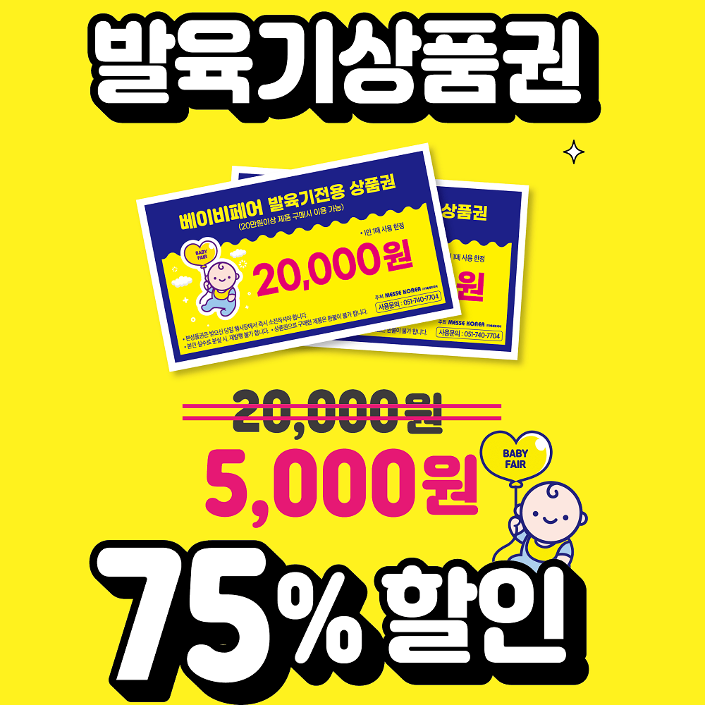 발육기 전용 상품권 75%할인권 100매 한정판매 ! 😎경북구미 베이비페어가 할인 쏩니다😎 발육기 제품 구매에 사용 가능한 2만원 상품권을 단돈 5천원에 판매 75% 할인된 가격🔥 5천원만 준비해주세요 🎁 경품 수령처에서 구매 가능합니다. 행사기간 내 100매 선착순 판매합니다😮 📢꼭 읽어주세요!📢 ❗발육기 상품권은 "유모차 / 카시트 / 아기띠 / 웨건" 제품만 사용 가능합니다❗ -제품 당 1매 구매 가능합니다. -본 상품권은 구매한 당일 행사장에서 소진하셔야 합니다. -본인 실수로 분실 시, 재발행 불가합니다. -상품권으로 구매한 제품은 환불이 불가합니다.