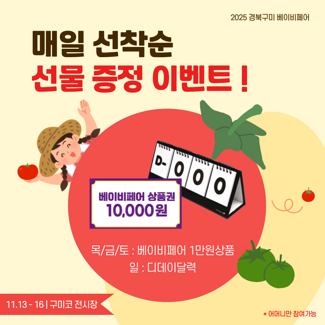 😎경북구미 베이비페어가 선물 쏩니다😎 베페 일찍 왔더니 선물이 와르르!! 🎁 베이비페어 1만원 상품권과 디데이달력 증정!! 🎁 📢꼭 읽어주세요!📢 ❗예비맘 또는 엄마 참여가능 (조부모님 참여불가)❗